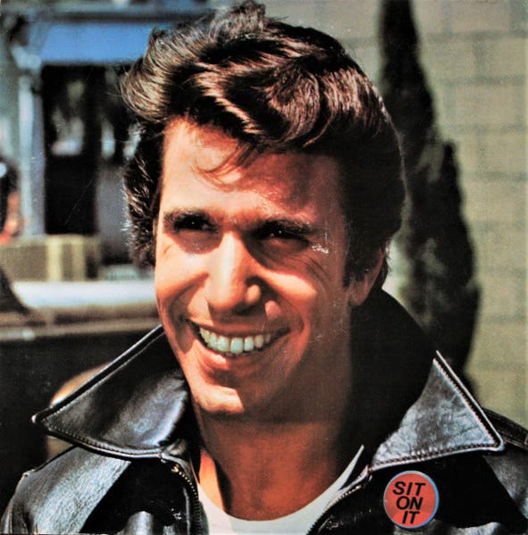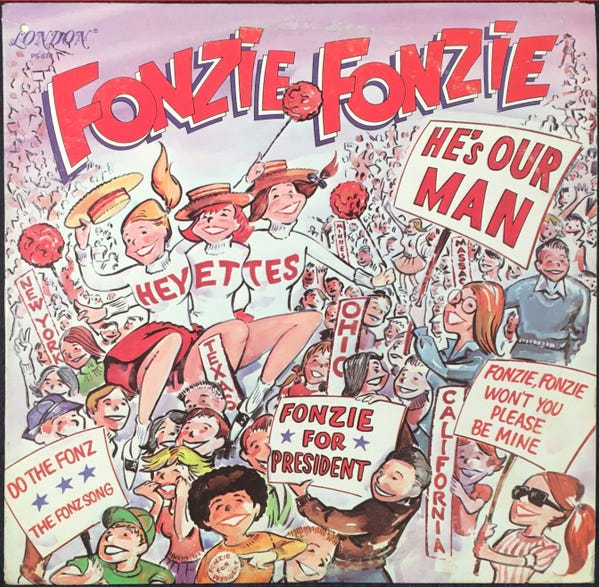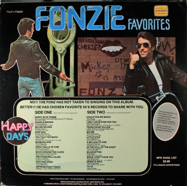 "Fonzie Favorites" was one of my very first LPs - alongside Heatwave's "Too Hot To Handle" and somehow the Beach Boys' bizarre "Love You". Using the Fonz's mug to stealth promote The Coasters and Lloyd Price and Little Richard was an act of low-key subversion, and I for one am happy I was co-opted! Sadly, this means I was also aware of "The Fonz Song", which you had to skip over at the top of side 2 to get to Chubby Checker.